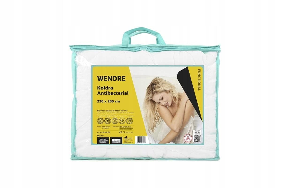 Protialergijska celoletna odeja 220 × 200 cm znamke Wendre je izjemno mehka in prožna. Zaradi gladke prevleke iz mikrovlaken je odeja mehka in prijetna na dotik. Inovativno polnilo ANTIBACT je posebej razvito vlakno z antibakterijskimi lastnostmi, zaradi česar je odeja prijazna do alergikov in pralna v pralnem stroju. Posebej oblikovana odeja je odlično zračna, preprečuje pršicam, da bi vanjo prodrle, poleg tega pa se zaradi svoje strukture prah ne useda nanjo.