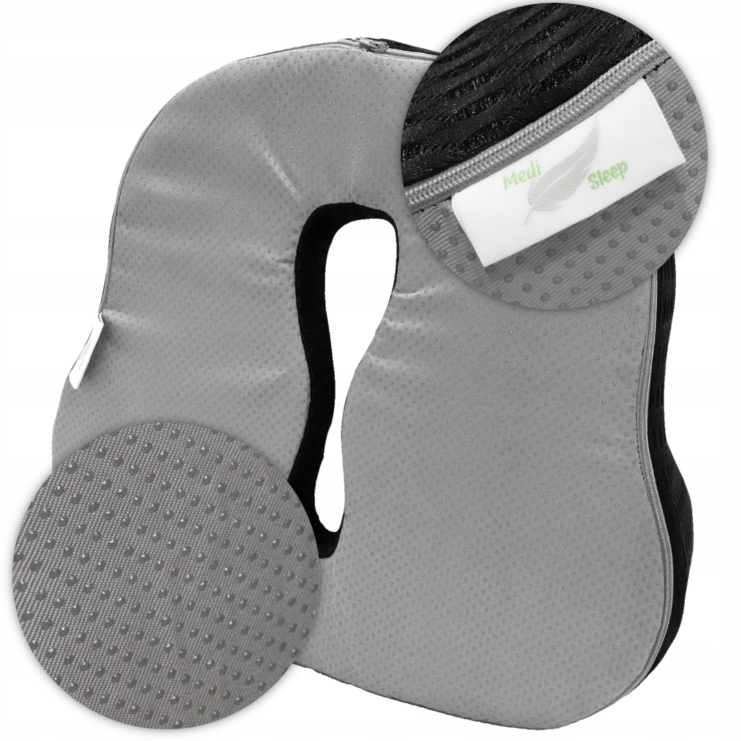ultra tankega zračnega materiala (kot v športnih oblačilih), , ki ni le prijeten na dotik. Zahvaljujoč temu materialu uporabnik ne občuti nelagodja zaradi potenja, niti med dolgotrajno uporabo. Zračna struktura materiala zagotavlja ustrezno kroženje zraka, kar poveča udobje. Elegantna oblika in nedrseča spodnja stran. Vzglavnik Medi Sleep združuje funkcionalnost z modernim, elegantnim videzom. Zaradi elegantne oblike se odlično poda k vsaki notranjosti – od pisarniških stolov, avtomobilskih sedežev do domačega pohištva. Vzglavnik je opremljen z gumijastimi čepi in posebej prilagojeno spodnjo stranjo, , ki zagotavlja odlične protidrsne lastnosti, kar zagotavlja stabilnost in varnost med uporabo.