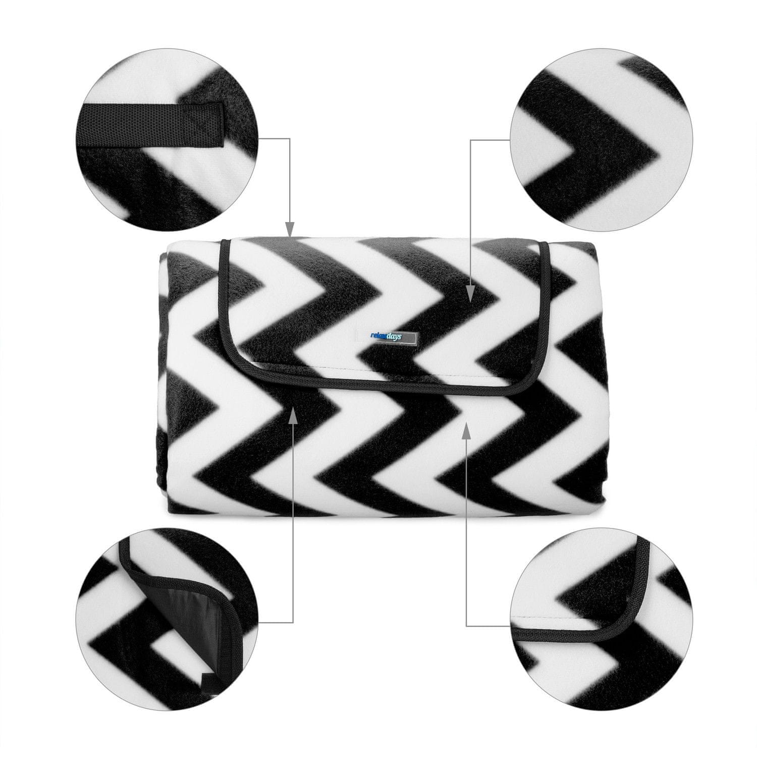 Izkusite udobje in stil s to vsestransko odejo za piknik, popolno za srečanja na prostem. Mehak material iz flisa zagotavlja prijeten prostor za sedenje, medtem ko črno-bel cik-cak vzorec doda pridih elegance.