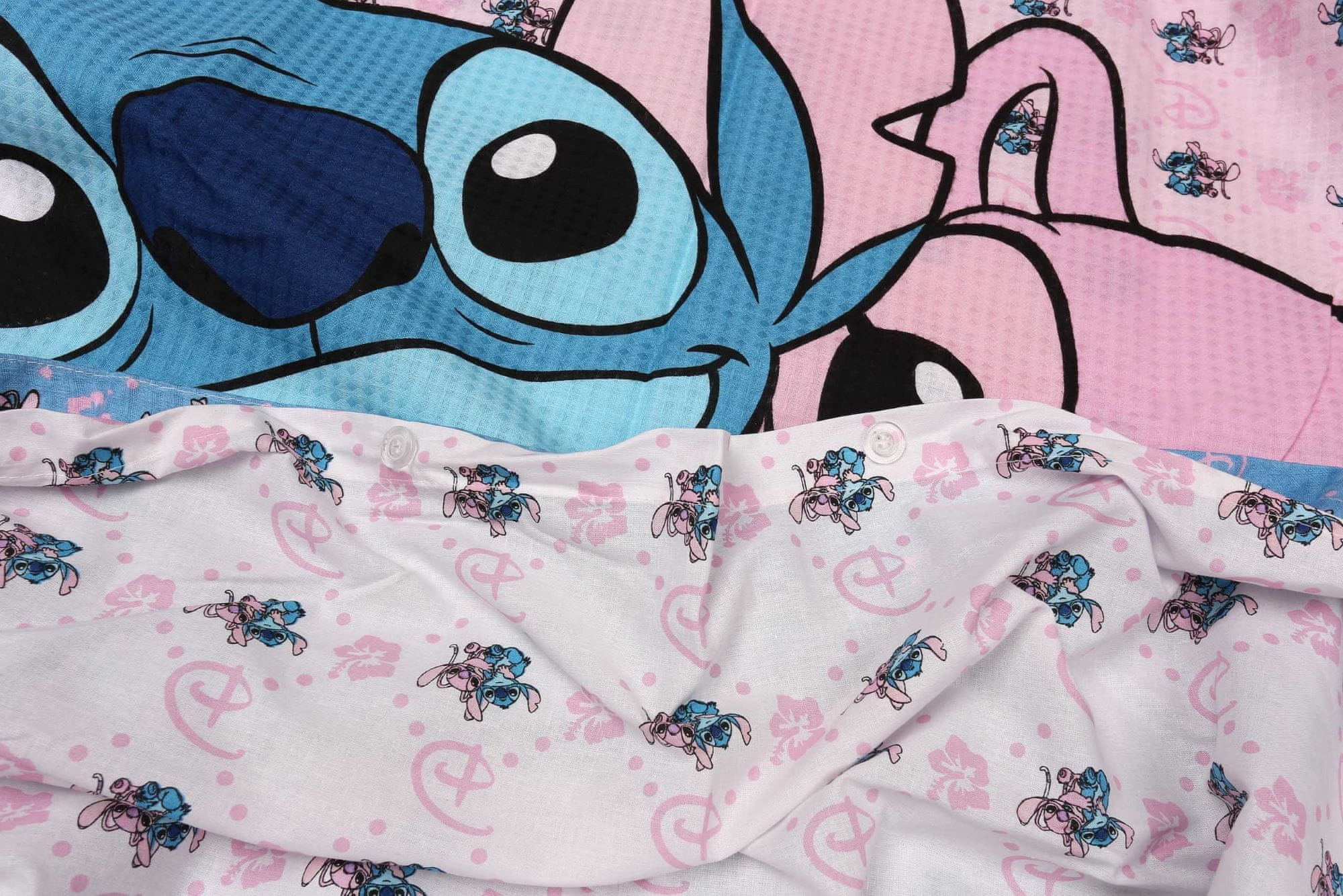 Modra posteljnina v velikosti 135 × 200 cm z očarljivim motivom Stitcha in Angela bo zagotovo všeč oboževalcem priljubljenega filma.