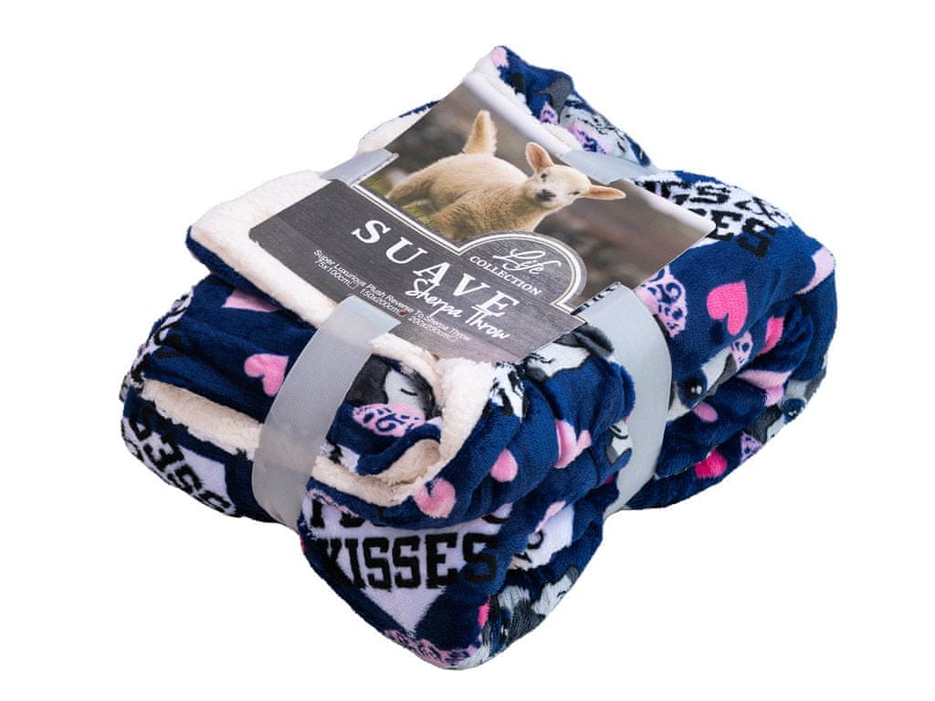 Ljubki dom Luksuzna modra ovčka deka iz mikropliša PUGS KISSES, 150x200 cm