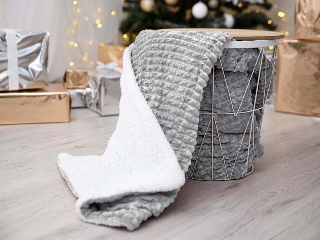 Ljubki dom Luksuzna svetlo siva deka z ovčko iz mikropliša s kockami, 150x200 cm