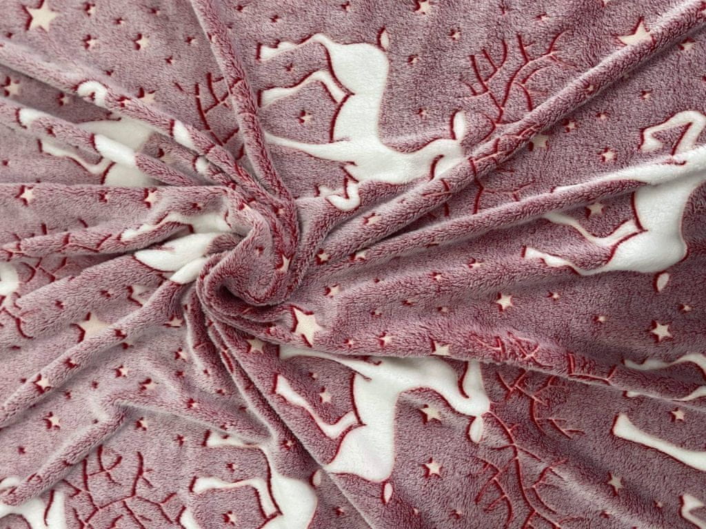 Božična mikroplišasta odeja STAR DEER v rdeči barvi bo v vaš dom vnesla čarobno praznično vzdušje. Motiv jelena in zvezde se ob osvetlitvi nežno sveti v temi in ustvarja očarljiv učinek, ki ga boste cenili v adventnih in božičnih večerih. Služila bo kot odličen praktičen dodatek in izvirna dekoracij