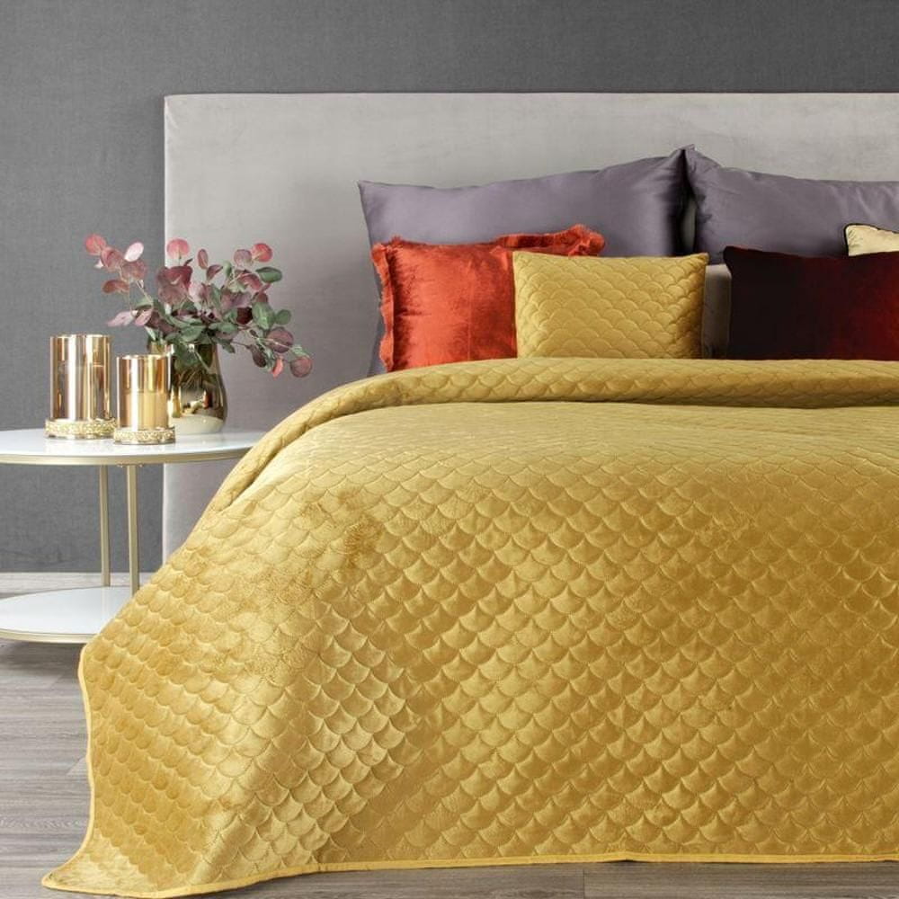 Klasično in zelo elegantno posteljno pregrinjalo iz mehkega žameta, prešito z modnim motivom tehtnice. Prešivanje izdelano po brezšivni metodi vročega stiskanja. širina: 220 cm, dolžina: 240 cm, barva: gorčica, teža: 180+70+100 GSM, sestava: 100% poliester