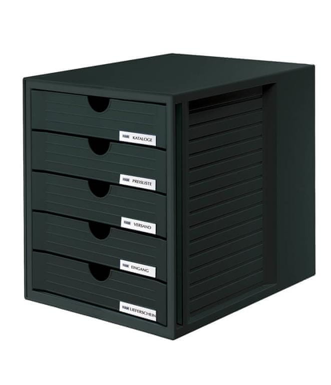 Standarden predalnik za vsako pisarno. Pet zaprtih predalov. Priložene nalepke za označevanje predalov. Višina je enaka višini registratorjev in je tako primerna za vstavljanje v pisarniške omare. Za dokumente do formata C4. Dimenzije: 275 × 320 × 330 mm (ŠxVxG). Celoten opis