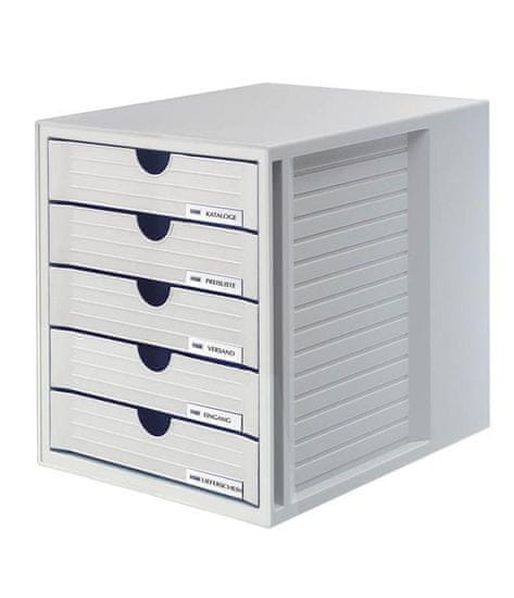 Standarden predalnik za vsako pisarno. Pet zaprtih predalov. Priložene nalepke za označevanje predalov. Višina je enaka višini registratorjev in je tako primerna za vstavljanje v pisarniške omare. Za dokumente do formata C4. Dimenzije: 275 × 320 × 330 mm (ŠxVxG). Celoten opis
