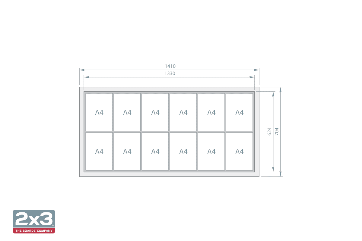 mere 62.4 × 133 cm (višina x širina),prostor za 12 listov v A4 formatu (297 × 210 mm) – 2 vrsti s po šestimi pokončnimi listi.