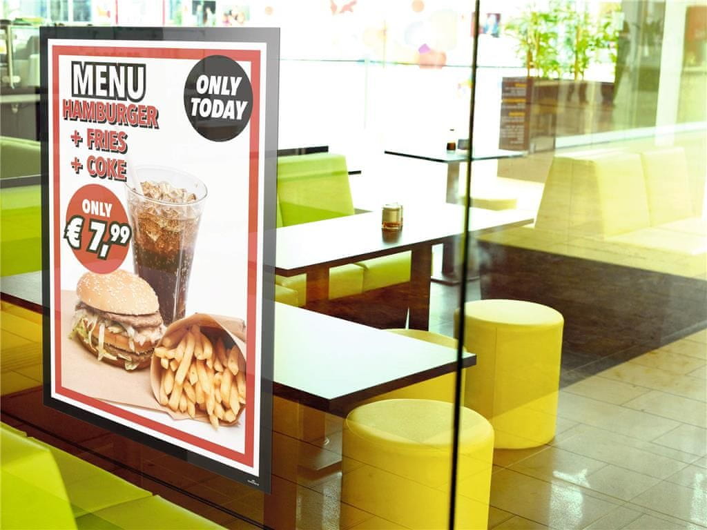 Primeren za prikaz informacij na stenah, steklenih površinah in v oknih. Hitro vstavljanje in enostavna zamenjava plakatov prek zgibnega magnetnega okvirja. Pritrditev brez mehurčkov zahvaljujoč dvema lepljivima trakoma na zadnji strani. Odstranjevanje brez ostankov z gladkih, pritrdilnih. Celoten opis