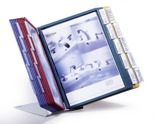 Namizno stojalo z 20 vloženimi predstavitvenimi mapami 5607 (5 rumenih, 5 rdečih, 5 zelenih, 5 modrih map). Za shranjevanje pogosto uporabljanih dokumentov. Kovinsko stojalo. Celoten opis