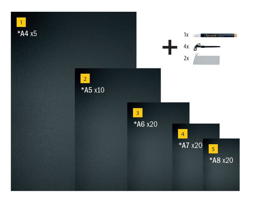 Securit TAG A4 kredna tabla (pralna), 5 kosov, črna + marker + pritrdilni elementi