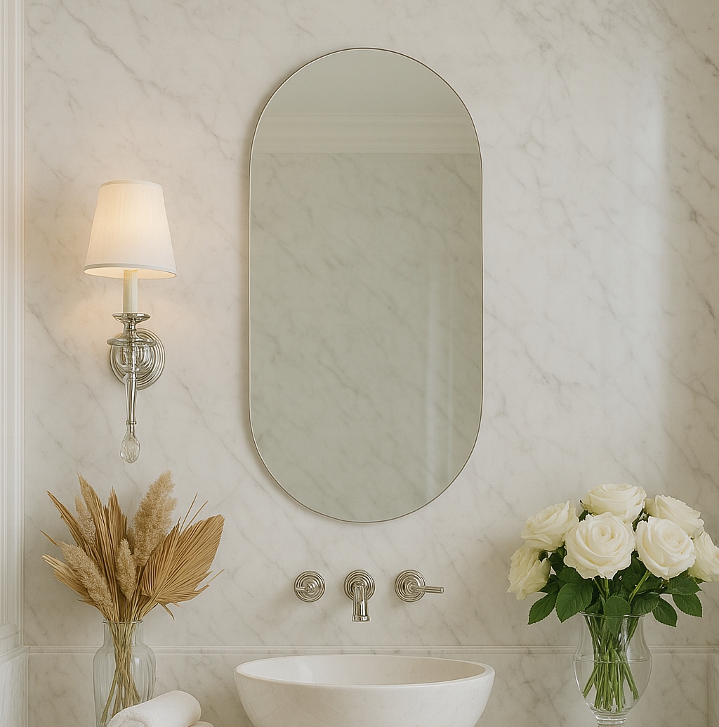Naša zavezanost odličnosti se kaže v vsakem elementu – od izbire stekla do končnih detajlov. Uporabljamo samo najkakovostnejše steklo, neposredno iz Francije, od priznanega podjetja Saint-Gobain, , kar zagotavlja neprimerljivo čistost in trajnost naših ogledal.