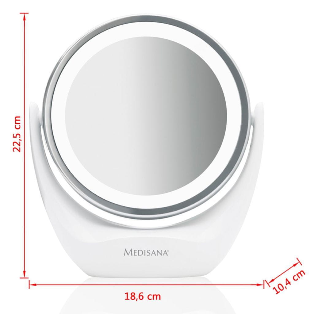 To dvo-stransko Medisana kozmetično ogledalo CM 835 je idealno za puljenje obrvi, nanašanje ličil, vstavljanje kontaktnih leč itd. Ogledalo se nahaja na obeh straneh. Z obračanjem ali vrtenjem ogledala lahko izberete naraven ali povečan odsev (5-kratna povečava), za lepotne tretmaje, Celoten opis