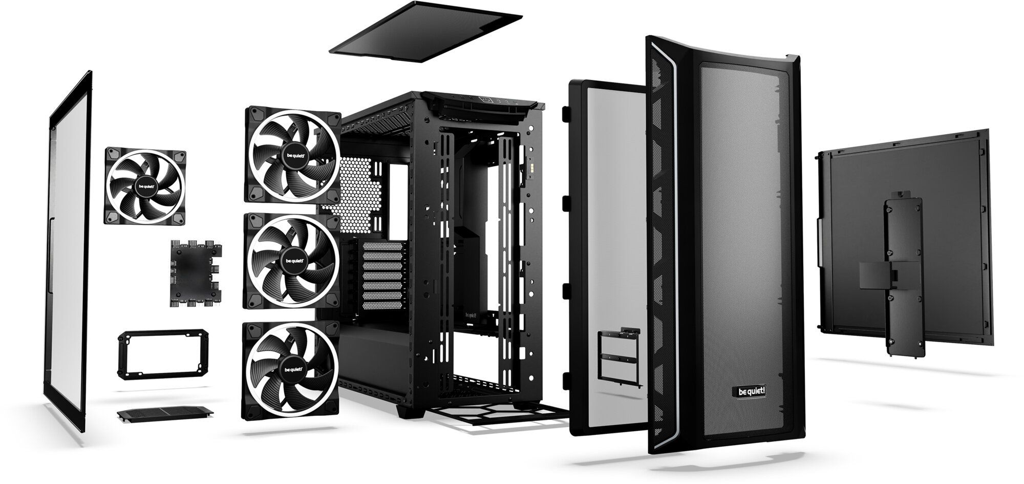 Ohišje je opremljeno z ventilatorji Pure Wings 3 velikosti 140 mm s PWM nadzorom, ki so skrbno optimizirani za zagotavljanje visokega pretoka zraka ob izjemno tihem delovanju. Njihova aerodinamična zasnova zmanjšuje turbulence in omogoča učinkovito hlajenje, kar je še posebej pomembno pri zahtevnejših sistemih, ki delujejo pod večjimi obremenitvami. Hkrati je Shadow Base 800 zasnovan tako, da podpira tudi napredne sisteme vodnega hlajenja, saj omogoča namestitev radiatorjev do velikosti 420 mm, kar uporabnikom omogoča popolno prilagoditev hlajenja glede na njihove potrebe.