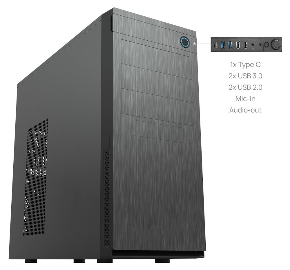 Odprto računalniško ohišje v sodobni zasnovi s ščetkanim učinkom ponuja en 2,5" položaj za SSD in štiri 3,5" položaje za trde diske. Na sprednji strani pod zgornjim pokrovom sta dva priključka USB 3.0, dva USB 2.0 in en priključek USB-C (USB 2.0 različica 480 Mbit/s). Na voljo sta tudi izhod za slušalke in vhod za mikrofon. Ohišje je lahko opremljeno s sprednjim in zadnjim ventilatorjem. V ohišju je dovolj prostora za procesorski hladilnik, visok do 155 mm, in grafično kartico, dolgo do 250 mm. Če odstranite kletko za dva 3,5-palčna trda diska, lahko uporabite grafično kartico dolžine do 380 mm. Ohišje je dobavljeno brez napajalnika.