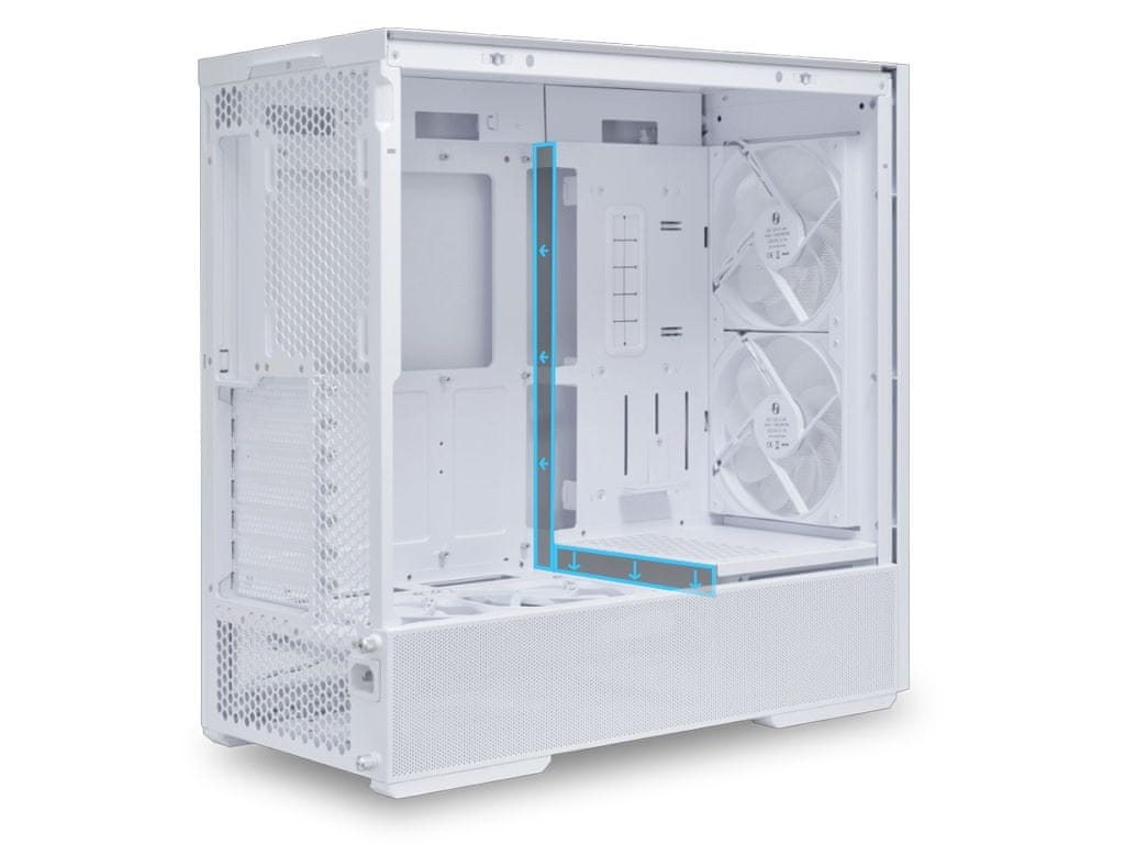 Pladenj za matično ploščo dovoljuje učinkovito hlajenje in odličen pretok zraka. Napajalnik je strateško postavljen na sprednji strani z vhodi na stran za enostaven priklop kablov. Priložen je tudi podaljšek za priklop napajalnika.