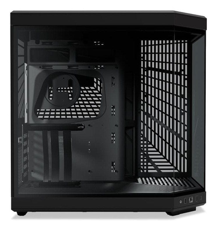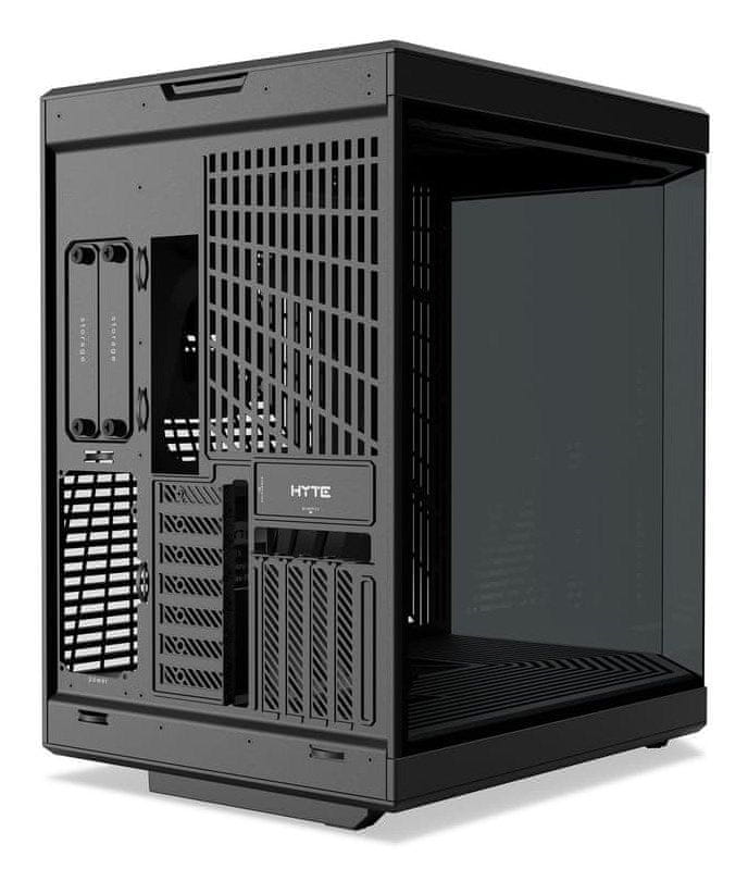 Ohišje HYTE Y70 ima sodoben in minimalističen dizajn s panoramsko sprednjo stranjo iz kaljenega stekla, ki učinkovito prikazuje notranjost računalnika in RGB osvetlitev. Dvokomorna zasnova omogoča, da so napajalnik in kabli skriti na dnu, kar zagotavlja čist in estetski videz ter olajša upravljanje kablov.