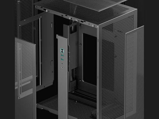 Ohišje je enostavno za vsakodnevno uporabo. Sprednja stranica ima 2× USB 3.0, 1× USB-C on kombiniran 3.5 mm vhod. Protiprašni filtri na štirih straneh poskrbijo za manj prašenja v notranjosti in enostavnejše vzdrževanje.