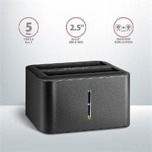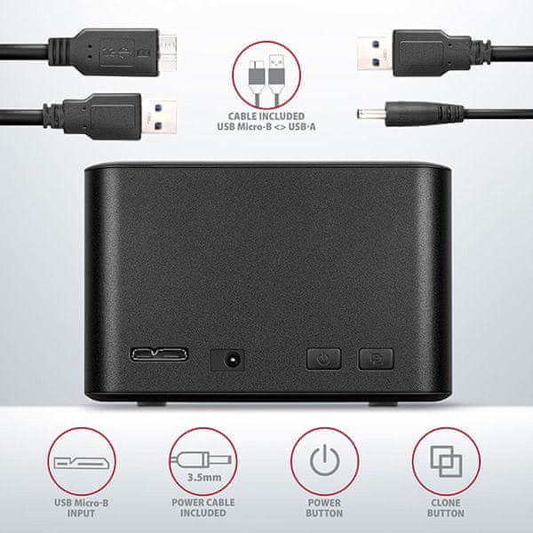 Superhitra dokovalna/klopna postaja AXAGON ADSA-D25 CLONE MINI SuperSpeed USB 5 Gb/s hitro in enostavno poveže do dva 2,5-palčna diska z računalnikom hkrati. Priključek USB Micro-B na doku skupaj s priloženim kablom USB Micro-B — USB-A omogoča povezavo z računalnikom.
