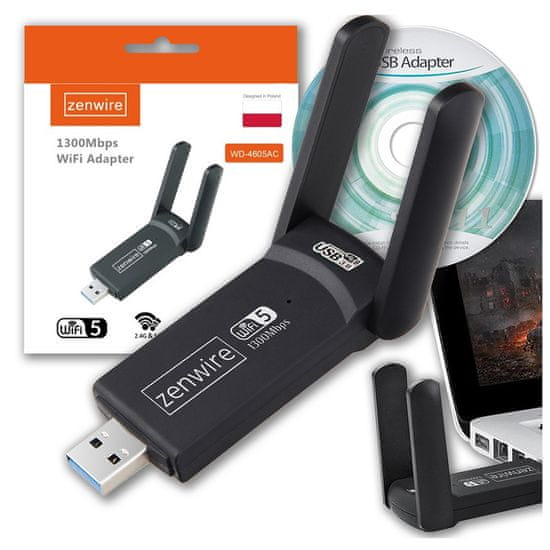 - Zenwire 1300 Mbps USB WiFi adapter z dvema zunanjima SMA 2dBi antenama.