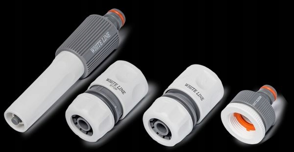 4-delni komplet z ravno šobo in hitrimi priključki za cev 1/2" ali 5/8". Na voljo v sivi in beli barvi. Komplet vsebuje: – ravno, nastavljivo šobo – hitri priključek za priključitev cevi 1/2" ali 5/8" – hitri priključek za priključitev cevi 1/2" ali 5/8" – priključek z notranjim navojem za pipo 3/4"