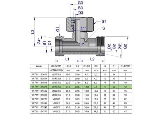 Simetrični metrični hidravlični T-kratnik BAB M18×1,5 12L (XEVT) Waryński (naprodaj v kompletih po 5) Celoten opis