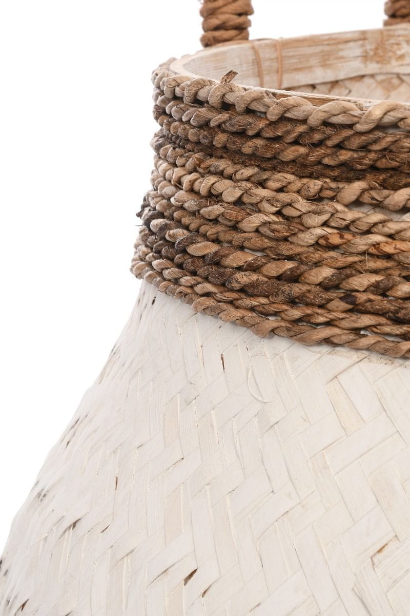 Lepa notranjost doma je urejena notranjost Naš veliki koš Kuno 50 × 50 × 50 cm vam bo pomagal obvladati tudi največji nered. Idealen je za otroške igrače, brisače ali kozmetiko. Izdelan je iz naravnih materialov, zato bo vsakemu prostoru dodal pridih razrednosti in elegance. Belo obarvan bambus bo polepšal vaš prostor in vam omogočil, da se boste počutili bližje naravi. Košara je opremljena z ročaji, ki olajšajo njeno premikanje. Kombinirate ga lahko z našimi izdelki Kuno v srednjih in majhnih velikostih ter tako ustvarite moden komplet.