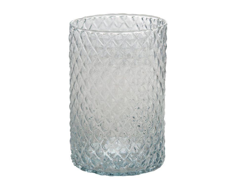 Steklena, okrašena, ročno izdelana vaza. Okras je podoben poplavi majhnih diamantov. V obliki valja. Primerna za rože in aranžmaje, kot dekoracija za dom. Premer: 15 cm, višina: 20 cm. Barva: prozorna.