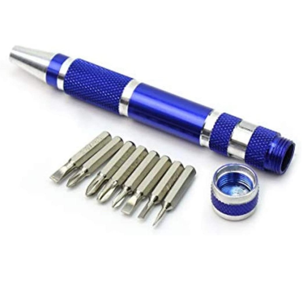 • V aluminijastem tulcu so štirje nastavki za izvijač Phillips in štirje navadni nastavki za izvijač.