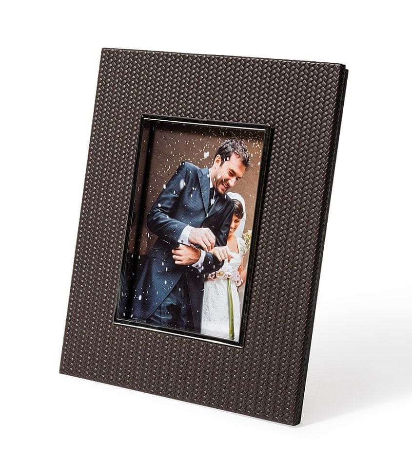 Pravokotni okvir za fotografije, prevlečen s telečjo kožo Firenze, ki je rahlo odporna na vodo in praske. Notranji okvir iz posrebrene medenine. Okvir se lahko uporablja navpično ali vodoravno. Celoten opis