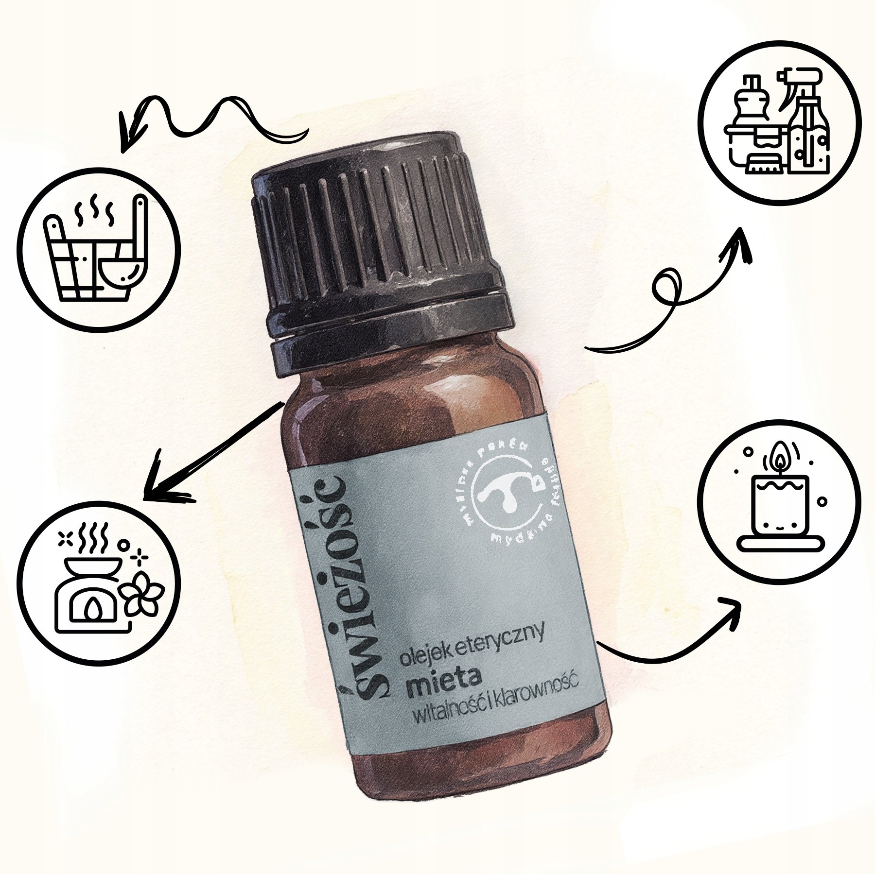 - Eterično olje „ Svežina “ je narejeno iz svežih listov in cvetočih vršičkov poprove mete . Brez umetnih dodatkov, barvil ali konzervansov – samo čista narava, zaprta v steklenički.
