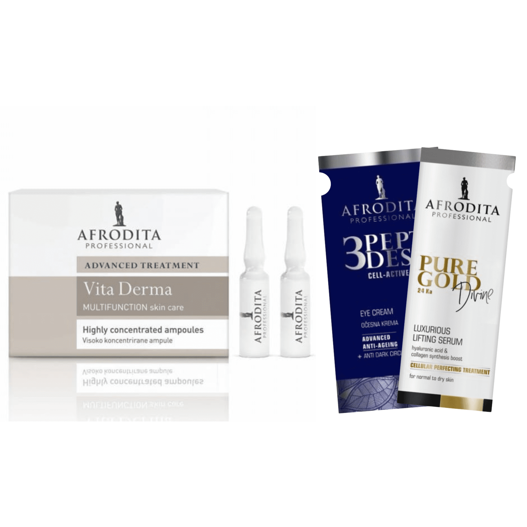 Afrodita Vita Derma ampule proti aknam + 2 vzorca. Specializirane, visoko koncentrirane polepšalne kapljice – učinkovita terapija za problematično kožo z madeži. Tip kože: mastna koža. Stanje kože: koža z madeži, problematična koža, koža z izrazitimi aknami, koža s čezmernim izločanjem sebuma. Ključne prednosti izdelka: Pomaga pri raztapljanju keratinskih čepov na površini por in jih tako očisti od znotraj. Z dosledno uporabo odpravlja nepravilnosti in preprečuje njihov ponovni nastanek. Pomaga pomiriti razdraženo kožo in spodbuja njeno revitalizacijo. Odstranjuje odmrle kožne celice in tako spodbuja regeneracijo kože. Delovanje: Zaradi visoke vsebnosti salicilne kisline te ampule proti aknam izstopajo po svojih nežnih antiseptičnih in adstringentnih lastnostih. Učinkovito odstranjujejo odmrle kožne celice, spodbujajo prekrvavitev kože, čistijo zamašene žleze lojnice in uravnavajo njihovo delovanje. Pomagajo pomiriti razdraženo kožo in spodbujajo revitalizacijo. Kako uporabiti: Ampulo nanesite na očiščen, razmaščen obraz in vmasirajte s konicami prstov. Po 15 minutah sperite in nanesite izbrano vlažilno kremo Afrodita Professional. Čez dan kožo zaščitite z zaščitno kremo VITA DERMA. Fotografija dveh vzorcev je naključna; vaše naročilo bo vključevalo naključne vzorce Afrodite. Če bodo vzorci razprodani, bomo dodali brezplačna darila Afrodita, kot so zvezek, pisalo, torbice ali drug pripomoček proizvajalca.