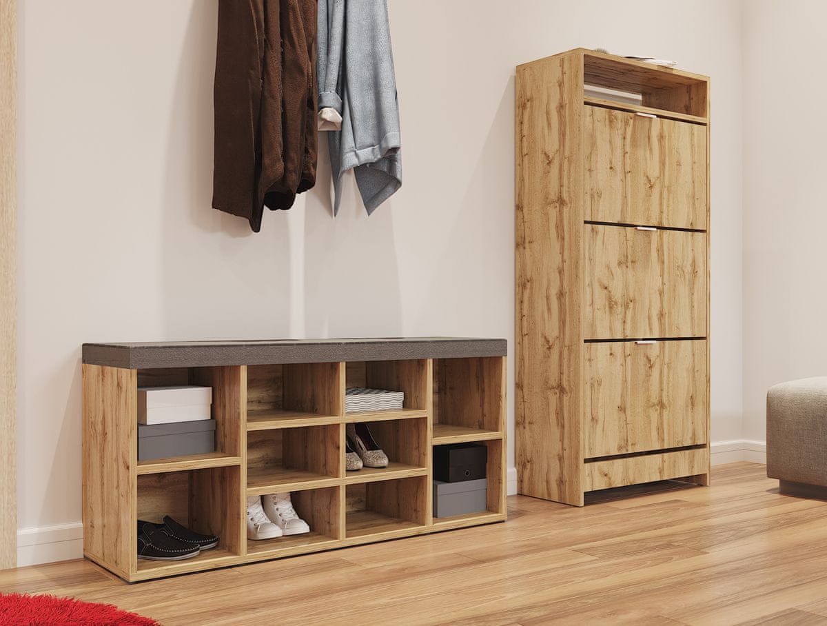 Omara za čevlje (omara za čevlje) SUTER S8 vam bo zagotovila dovolj prostora za shranjevanje vaših čevljev, da bodo ti vedno v redu, predsoba pa harmonično pospravljena in čista. Izdelana je iz visokokakovostnih materialov, v čudoviti barvni izvedbi betona, ki je primerna za vsako moderno ali klasično predsobo, za vsako notranjo opremo. Sestavljen je iz treh zaprtih omaric na tečajih in odprtega prostora za shranjevanje, kamor lahko odložite ključe, denarnico ali različne okrasne dodatke. Njegove skupne mere so (ŠxGxV): 60×27×132 cm in je dostavljen razstavljen.