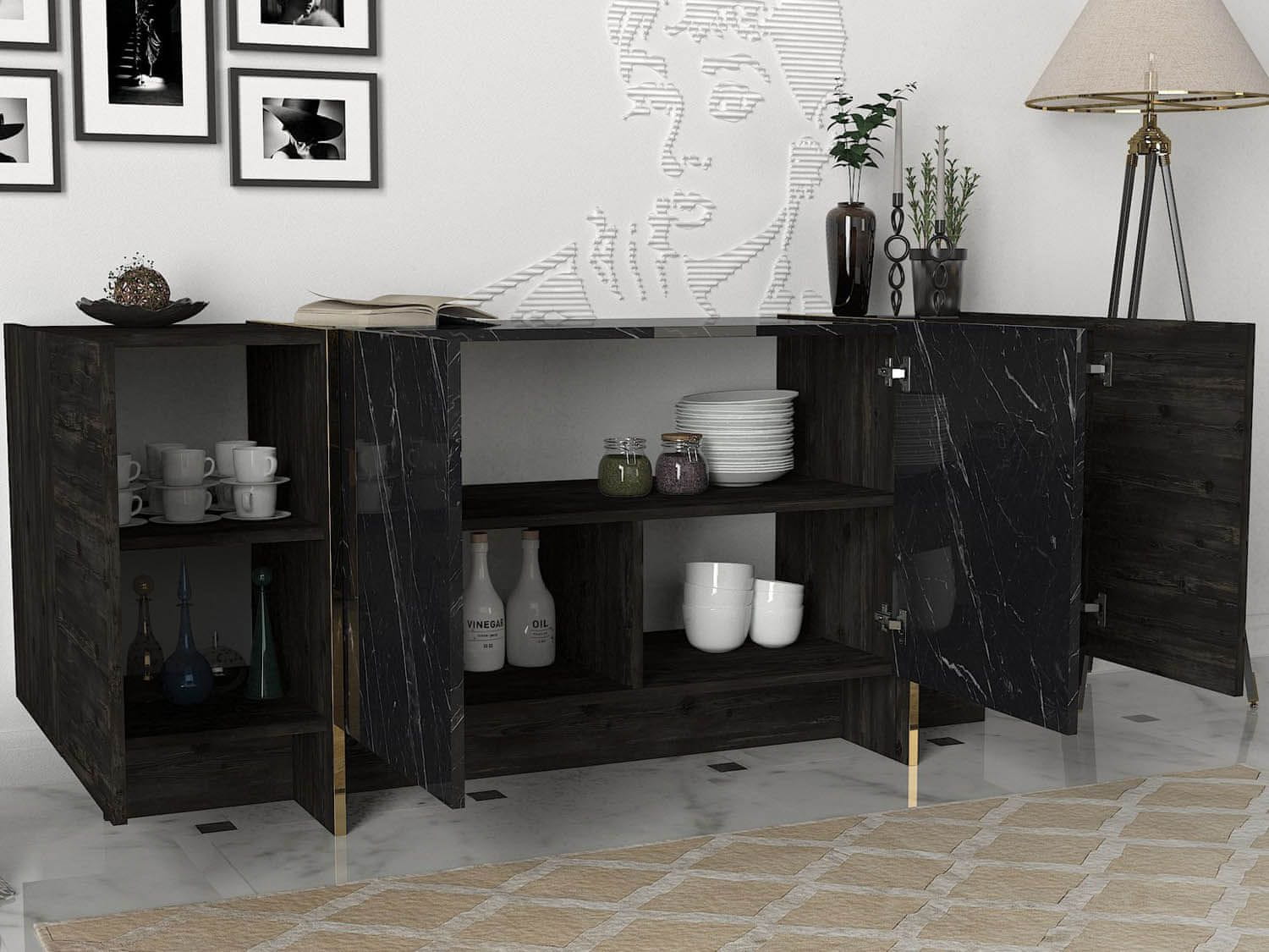 Komoda BORMIO je eleganten in sodoben kos pohištva, ki bo zagotovo pritegnil pozornost vsakega obiskovalca vašega doma. Njena privlačna površina v imitaciji marmorja se popolnoma ujema s trendom sodobnega oblikovanja in bo dodala svoj edinstven pridih kateremu koli prostoru. Komoda nudi veliko shranjevalnega prostora, kar vam bo omogočilo urejen videz dnevne sobe ali spalnice.