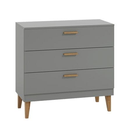Predalnik KELLY se ponaša z modernim skandinavskim videzom, ki izgleda odlično v vsakem domu! Moderna barva kombinacija in dizajn bosta vaš dom modernizirala in v njem ustvarila prijeten ambient. Predalnik je razdeljen na tri prostorne predale v katere lahko pospravite obilo igrač in oblačil. Univerzalni videz predalnika vam omogoča, da ga uporabite v različnih prostorih svojega doma, saj povsod izgleda odlično.