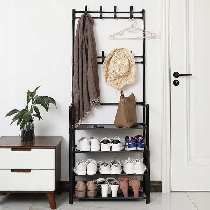 Obešalnik za oblačila s policami za čevlje je odlična rešitev za organiziranje naših jaken in razporeditev kupa čevljev, ki ležijo v predsobi ali omari. Vse skupaj je ozko, tako da ga zlahka spravimo v predsobo. Odlično se bo obnesel tudi v šolah ali vrtcih za shranjevanje čevljev in jaken.