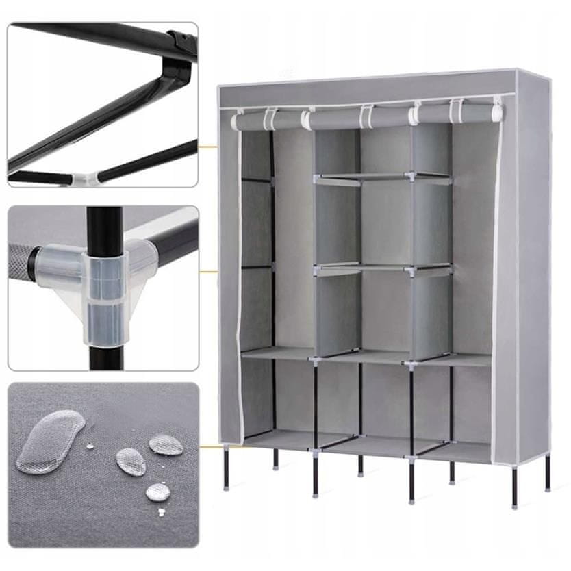 Izjemno praktična, zložljiva omara z 8 policami iz nepremočljivega materiala in dvema obešalnima prečkama oblačila.