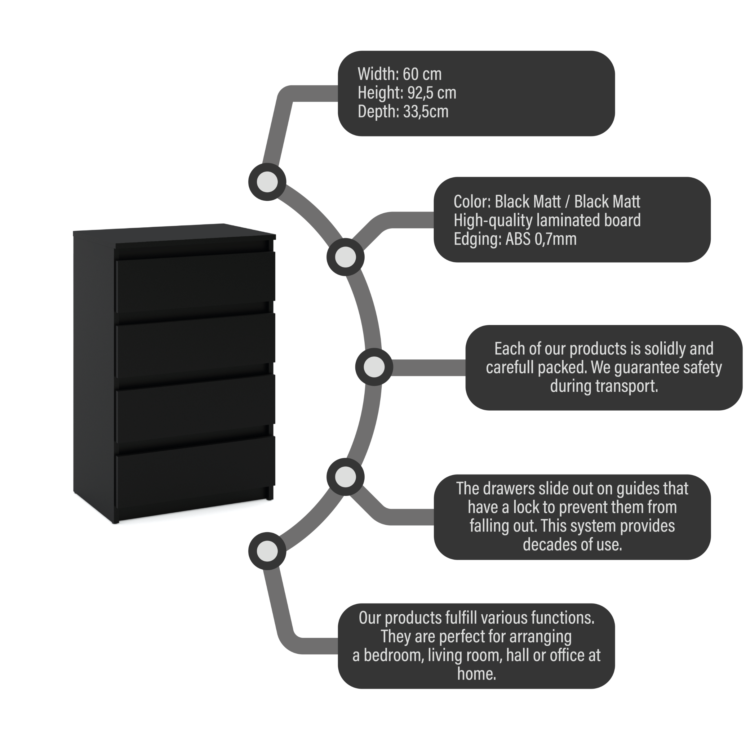 Črna komoda 60 CM 4 predali TV omarica Komoda za dnevno sobo Celoten opis