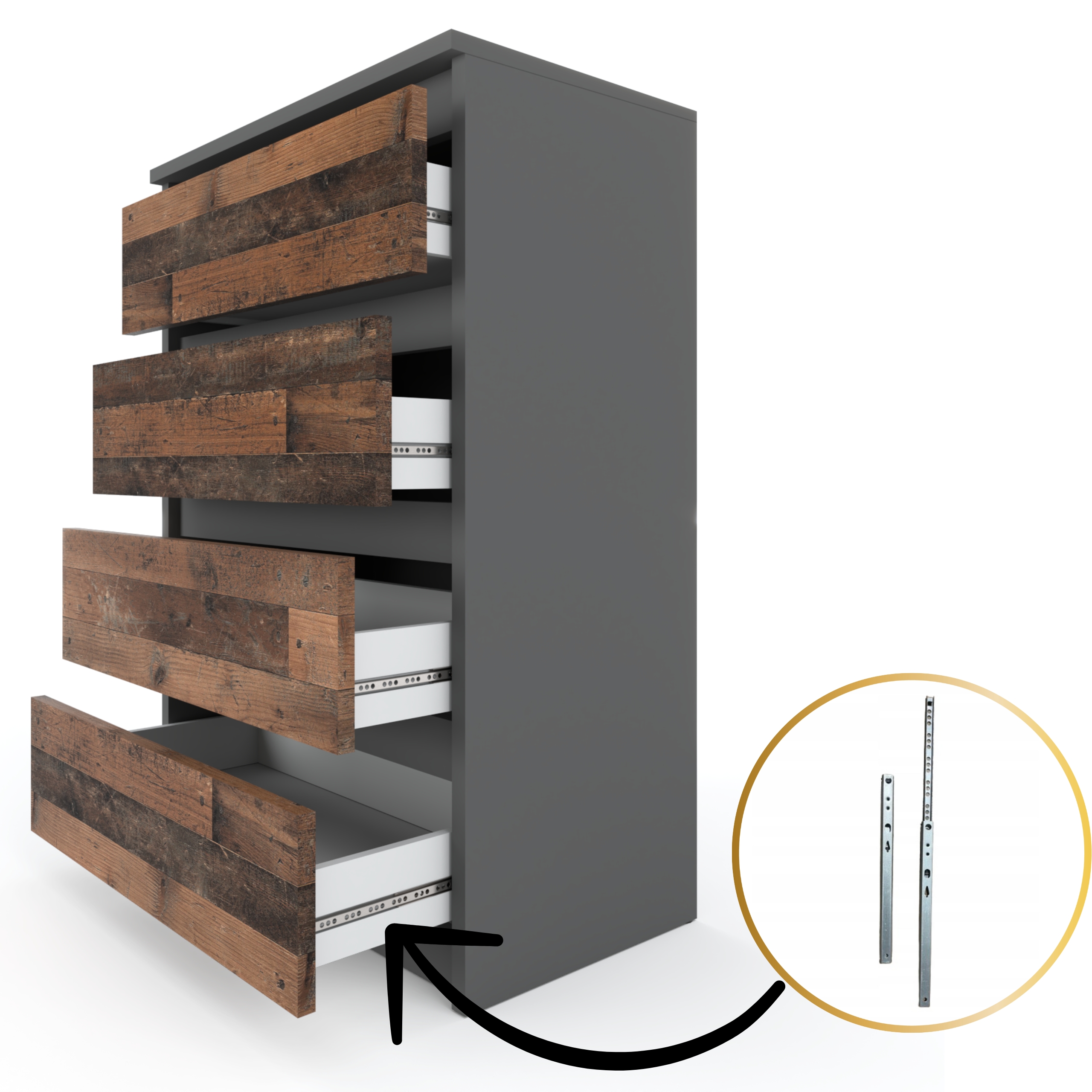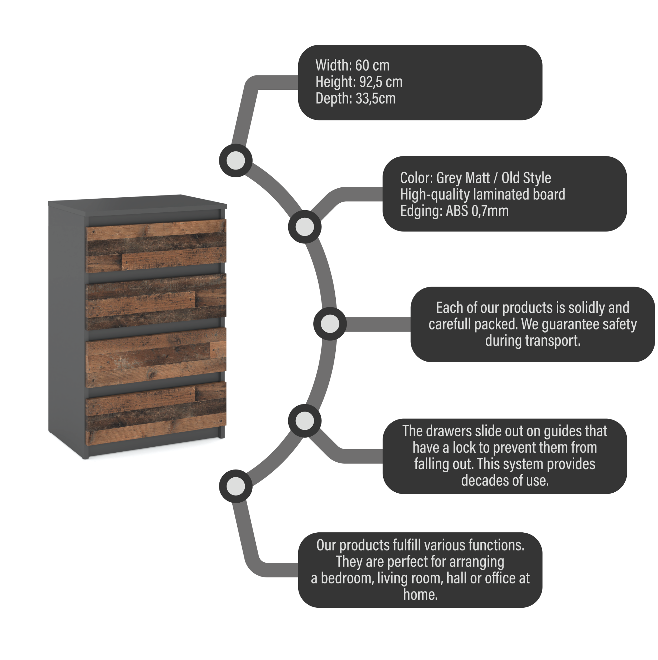 Odkrijte eleganco in funkcionalnost z našo novo komodo Old Style Matt Grey s 4 predali. Sodoben dizajn s frontami brez ročajev, masivno laminirano ploščo, mat površino in praktičnimi predali za optimalno organizacijo. Popoln za vsako notranjost.