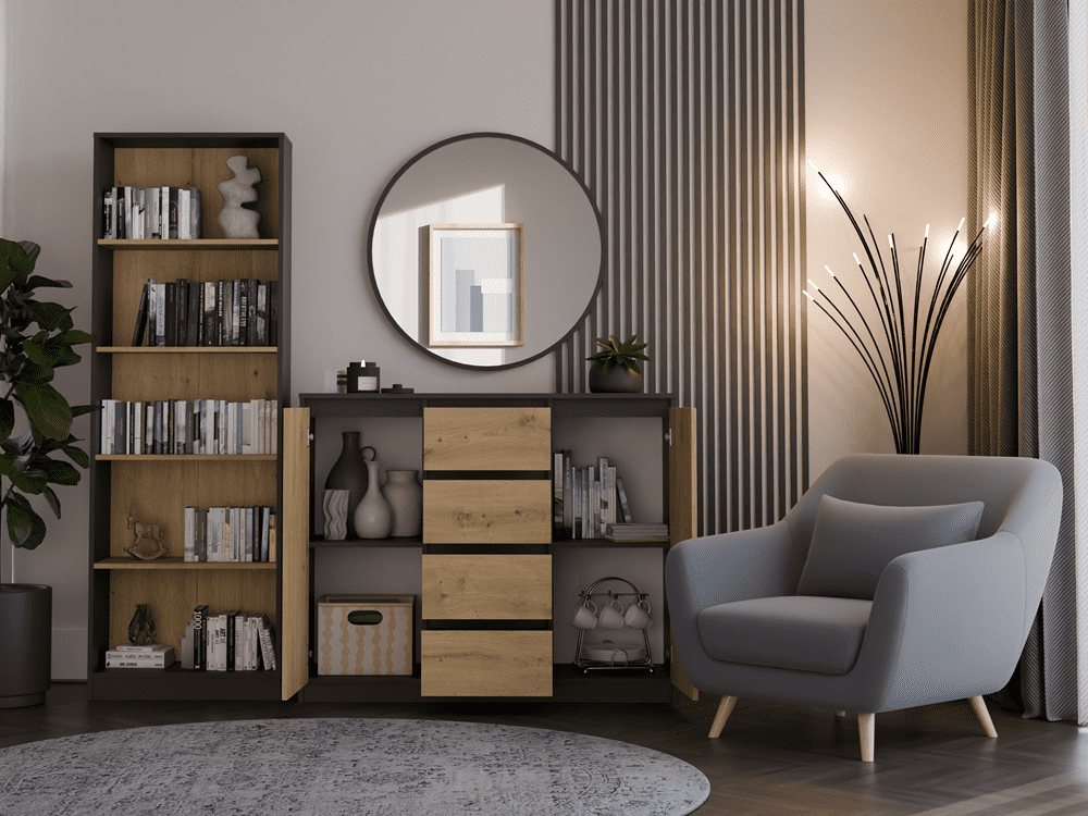Notranjost komode je sestavljena iz polic in štirih predalov, ki vam bodo pomagali pri urejanju stvari. Lažje boste našli, kar iščete.