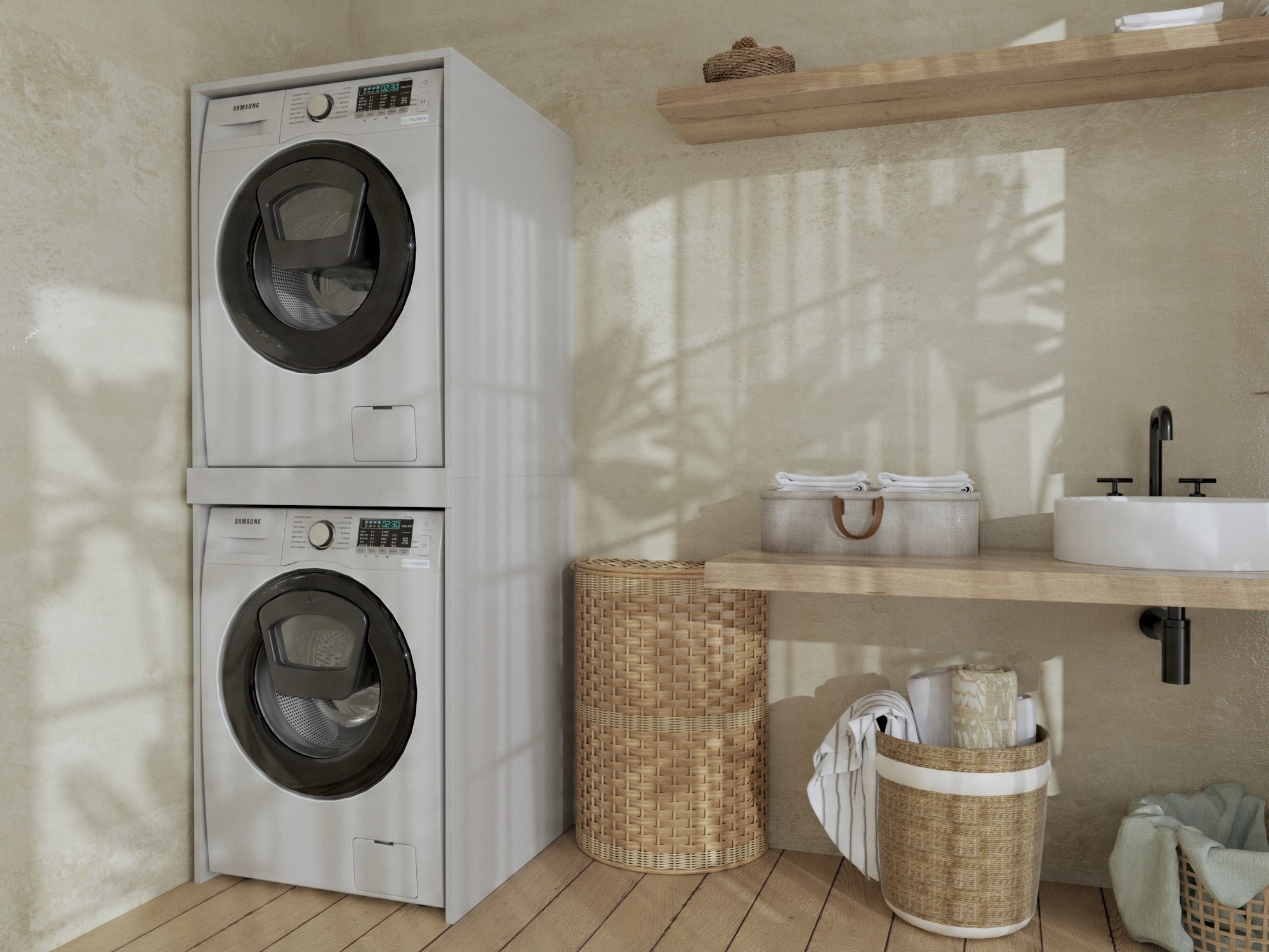 Ta omarica za pralni in sušilni stroj je odlična rešitev za vse, ki želijo združiti modernost s funkcionalnostjo. Je odlična izbira za shranjevanje pralnega in sušilnega stroja. Popolna je za kopalnico, pralnico ali omaro. Ta praktična omarica za pralni in sušilni stroj je kos pohištva, ki se poda v vsako kopalnico. Zaradi svoje preprostosti in klasične oblike je odličen dodatek tako k moderni kot minimalistični notranjosti. Omarica ustvarja eleganten prostor za pralni in sušilni stroj. Ponaša se z najvišjo kakovostjo izdelave in edinstvenim videzom.