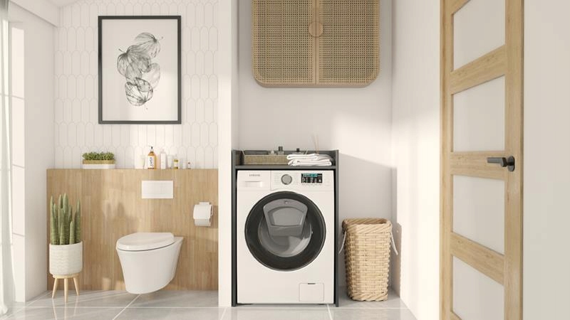 Ta praktična omarica za pralni stroj je kos pohištva, ki se poda v vsako kopalnico.