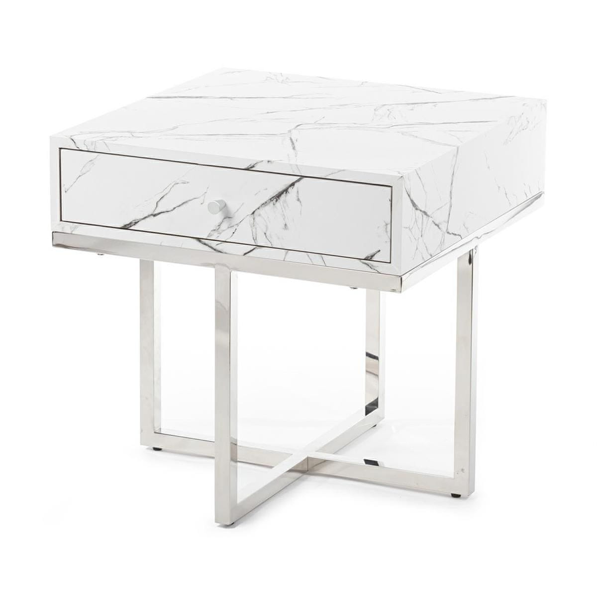 Nočna omarica je praktičen kos pohištva, ki bo vaši spalnici dodal edinstven značaj in polepšal njen videz. Nočna omarica je nepogrešljiv kos pohištva, ki je odlično mesto za svetilko, budilko ali knjigo. Miza ima predal, v katerega lahko shranite veliko osnovnih stvari, ki jih želite imeti pri roki. Edinstveno podnožje je izdelano iz nerjavečega jekla, vrh pa iz masivnega MDF. Ta funkcionalen kos pohištva bo eleganten dodatek za vsako spalnico.