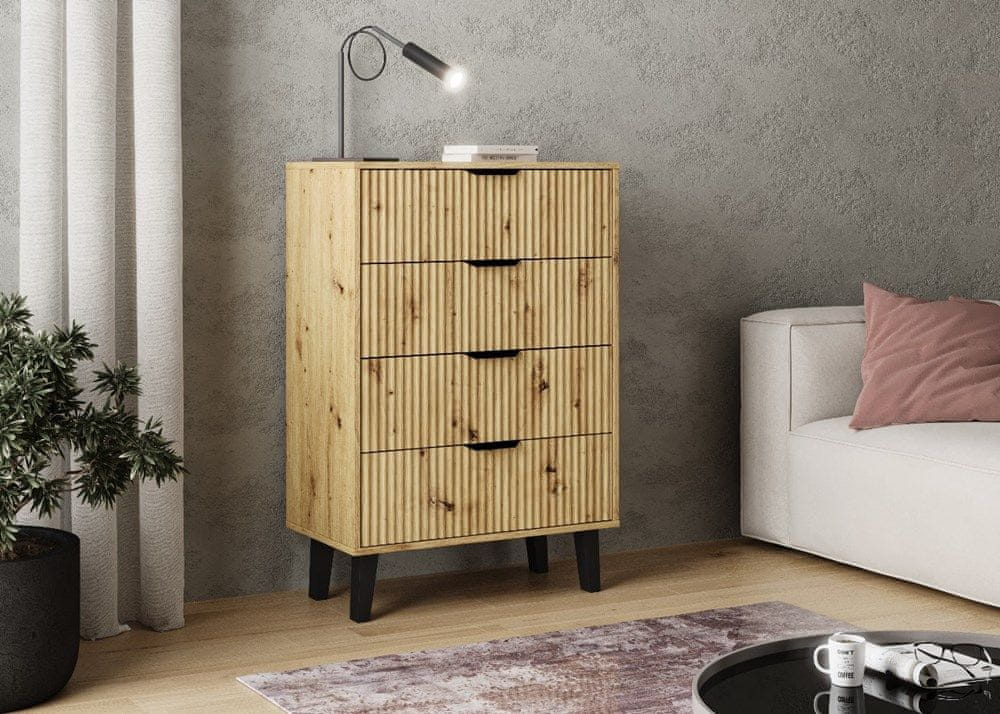 KOMODA SCANDI 4S SLIM je idealna ponudba za tiste, ki iščejo praktično enoto za shranjevanje s pridihom modernega dizajna. Topel odtenek hrasta Artisan v kombinaciji z utorjenimi sprednjimi stranmi in visokimi črnimi nogami daje notranjosti prijeten, a hkrati eleganten občutek.