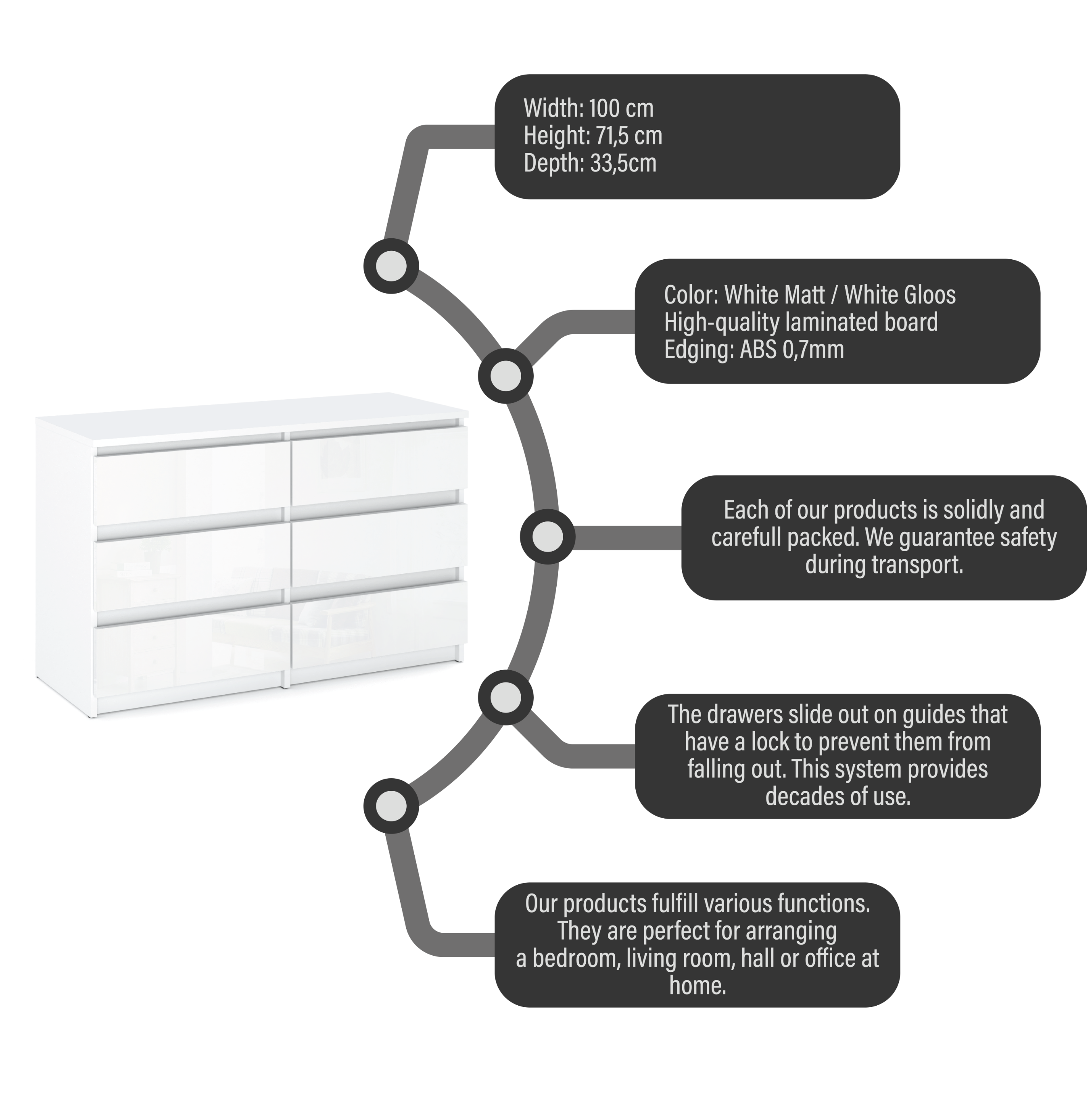 •     Enostaven za čiščenje:Sijajni bel material je enostaven za čiščenje; vlažna krpa je dovolj, da bo komoda videti nova.