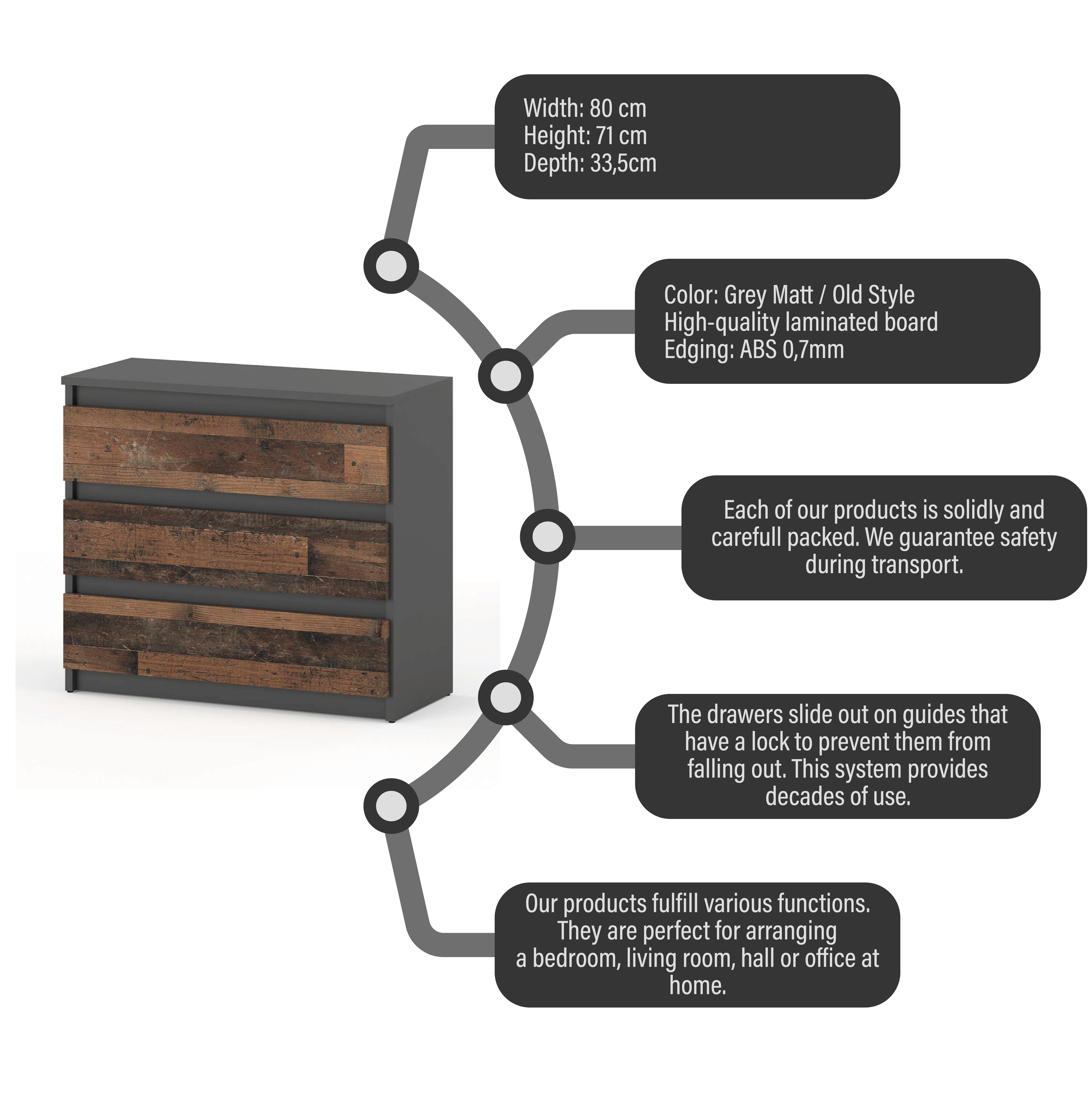 - Komoda meri 80 cm v širino, 71,5 cm v višino in 33,5 cm v globino – standardne zahteve za tovrstno pohištvo.