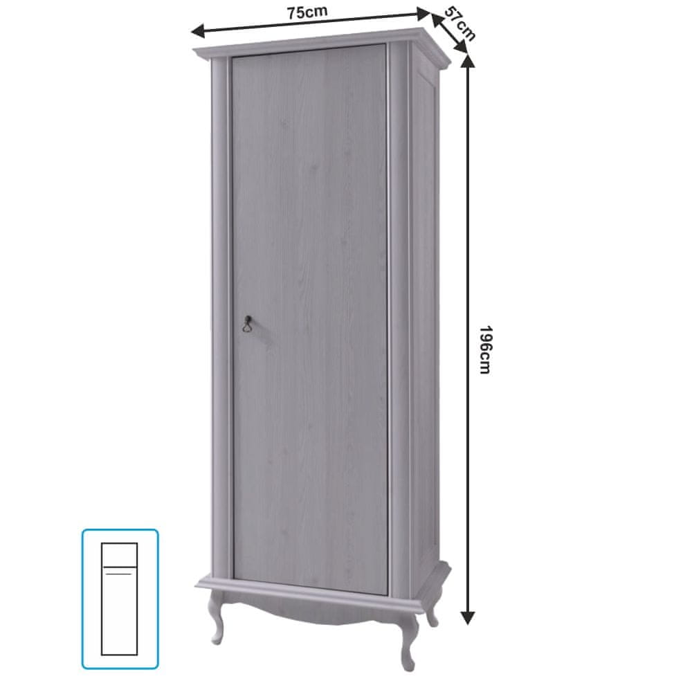 Eden od sestavnih delov čudovitega sekcijskega pohištva je garderobna omara VILAR DA3. Njene dimenzije (ŠxGxV): 75×57×196 cm, višina spodnjega prostora od tal je 15 cm. Trdne lesene noge mu dajejo stabilnost, za odpiranje pa skrbi dizajnerski kovinski ročaj. Garderobna omara ponuja prostor za shranjevanje v obliki obešalne palice in polic. Če želite reprezentativno bivanje, si oglejte profilno pohištvo Vilar. V baročnem stilu in s 3D učinkom doda prostoru pridih razkošja, zahvaljujoč kateremu bo vaša dnevna soba videti razkošno in razkošno. Dekorativni elementi izgledajo romantično in ekskluzivno. Pohištvo je izdelano iz laminirane DTD (iverne plošče) debeline 30 mm z masivnimi ABS robovi. Barvna različica belega bora se elegantno zlije z vsakim interierjem. Ustvarite pravo toplino svojega doma s tem čudovitim sektorjem. Z njim lahko okrasite svojo jedilnico, pa tudi dnevno sobo.