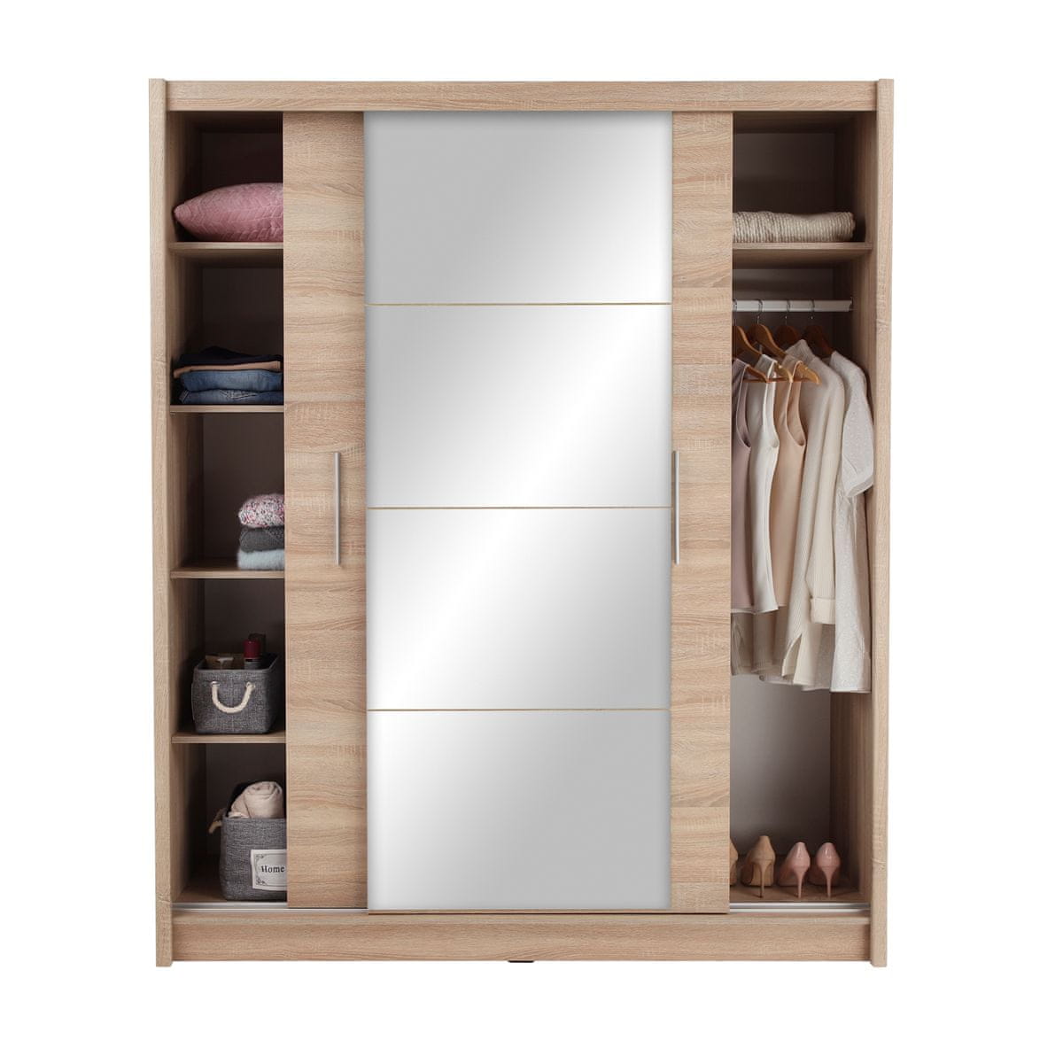 Omara z drsnimi vrati LOW je moderna rešitev, ki se prilega vsakemu domu in postane dominantna točka vaše sobe. Zahvaljujoč drsnim vratom se odlično obnese tudi v manjših prostorih, saj pri odpiranju ne posega v prostor. Notranjost omare je praktično razdeljena – en del je sestavljen iz polic z nosilnostjo 5 kg, drugi del pa je opremljen s palico za obešanje z nosilnostjo 5 kg, tako da imate oblačila vedno urejena in pri roki. Omara je izdelana iz kakovostne laminirane DTD debeline 16 mm, dopolnjena z ABS robovi in letvami iz MDF folije, kar zagotavlja vzdržljivost in dolgo življenjsko dobo. Hrast sonoma deluje elegantno in s čistim videzom, medtem ko veliko ogledalo optično poveča prostor in daje omari pridih razkošja. Z dimenzijami (ŠxGxV): 180×61×215 cm in težo 147 kg ponuja dovolj prostora za vse vaše stvari. Za daljšo življenjsko dobo ni priporočljivo obremenjevati zgornje plošče. Omara Low je dobavljena v razstavljenem stanju.