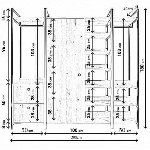 100 % MELAMINSKO PREVLEČENA IVERNA PLOŠČA Debelina: 18 mm Elektrostatično prašno prevlečen kovinski okvir Širina: 200 cm Višina: 180 cm Globina: 40 cm Velikost predalov: 40 cm: Širina: 56 cm Višina: 28 cm Globina: 40 cm Višina notranje police: 38 cm Velikost stranske police: 38 cm: Širina: 56 cm Višina: 25 cm Višina noge: 8 cm 2 predala Številne police Lahko se pritrdi na steno