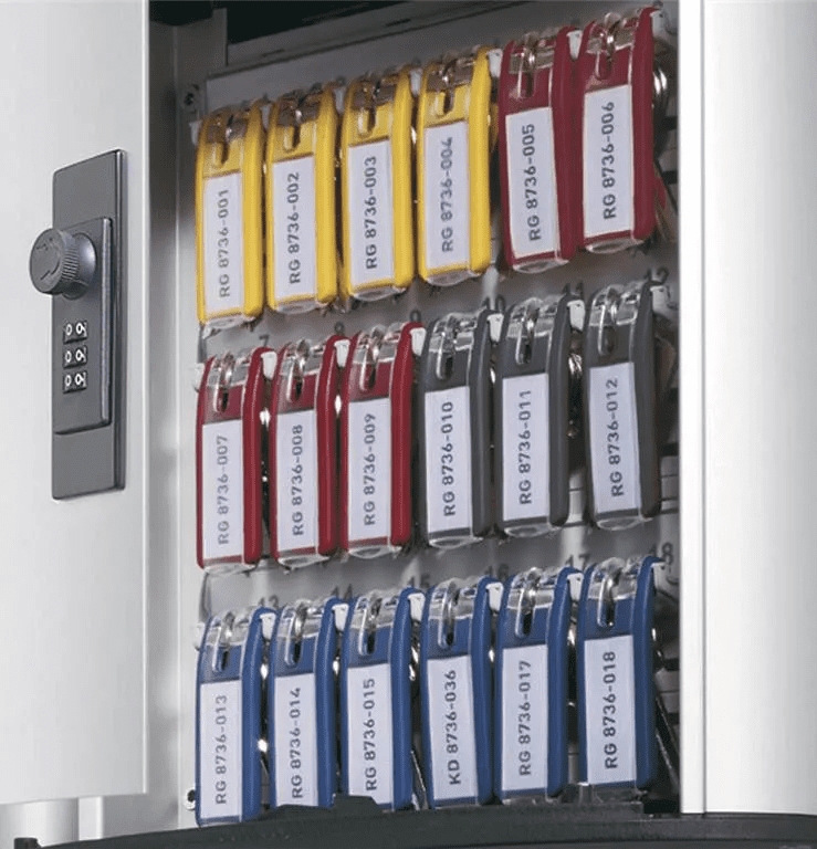 omarica za shranjevanje ključev na patentiranih obeskih Durable 1957 vključno s 6 obeski za ključe različnih barv obešalniki za ključe so na obeh strnaeh sprednje plošče zaklepanje omarice s tri-številčno kodo dimenzije 302 × 208 × 118 mm