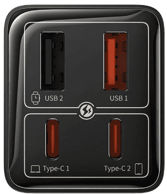 Polnilnik je opremljen s štirimi priključki – dvema USB-C in dvema USB-A – kar omogoča hkratno polnjenje do štirih naprav. Ta vsestranskost vam omogoča, da s seboj vzamete en sam polnilnik za vse svoje naprave, kar prihrani prostor in zmanjša potrebo po dodatni opremi.